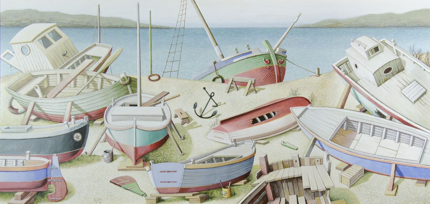 Giovanni Duiz Trieste 1923 "Barche in secca" cm. 50x105 - olio su compenssato Firmato b. a s. e datato '