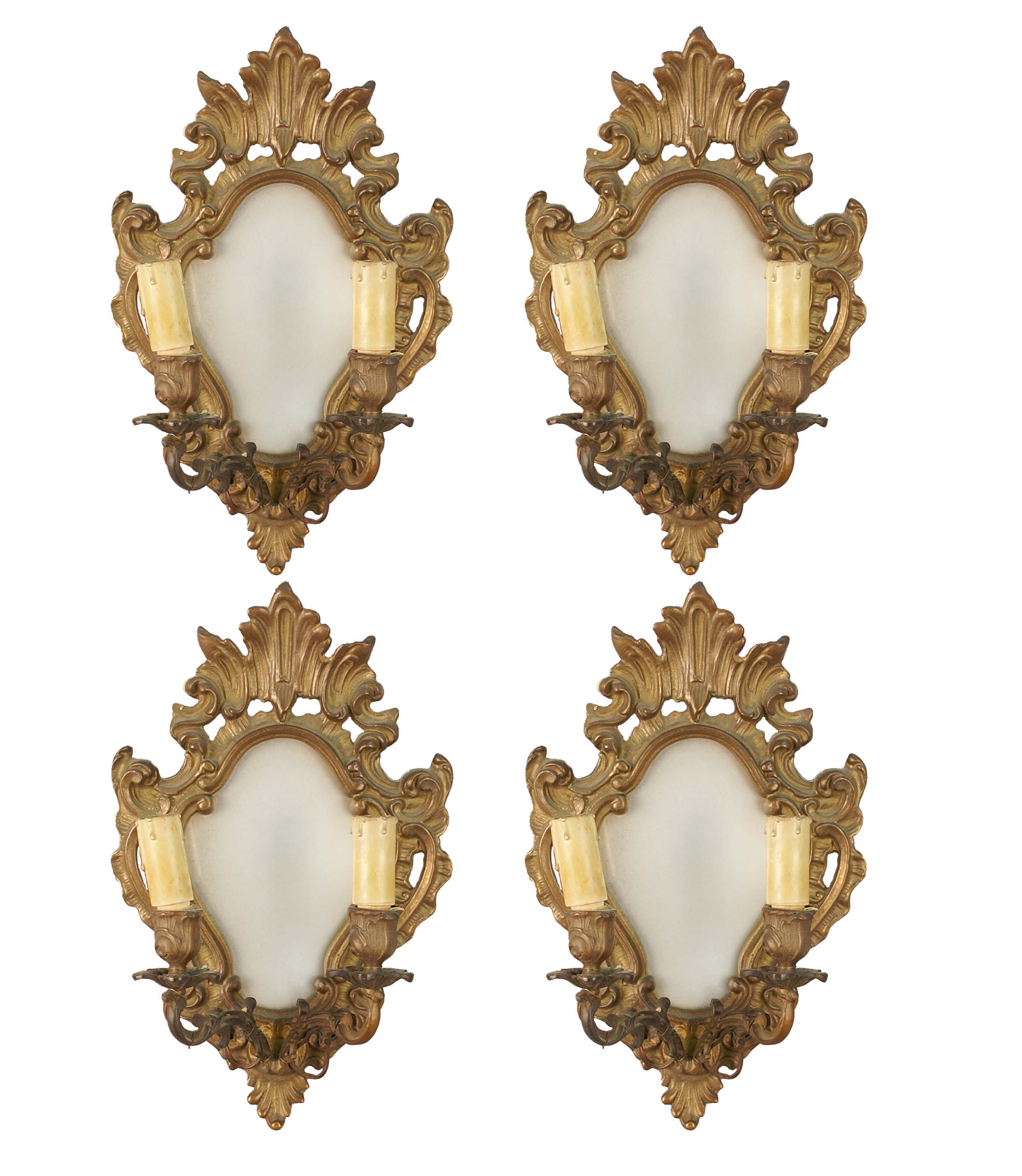 Quattro specchierine con relative appliques in bronzo brunito, vecchia manifattura, cm. 33.