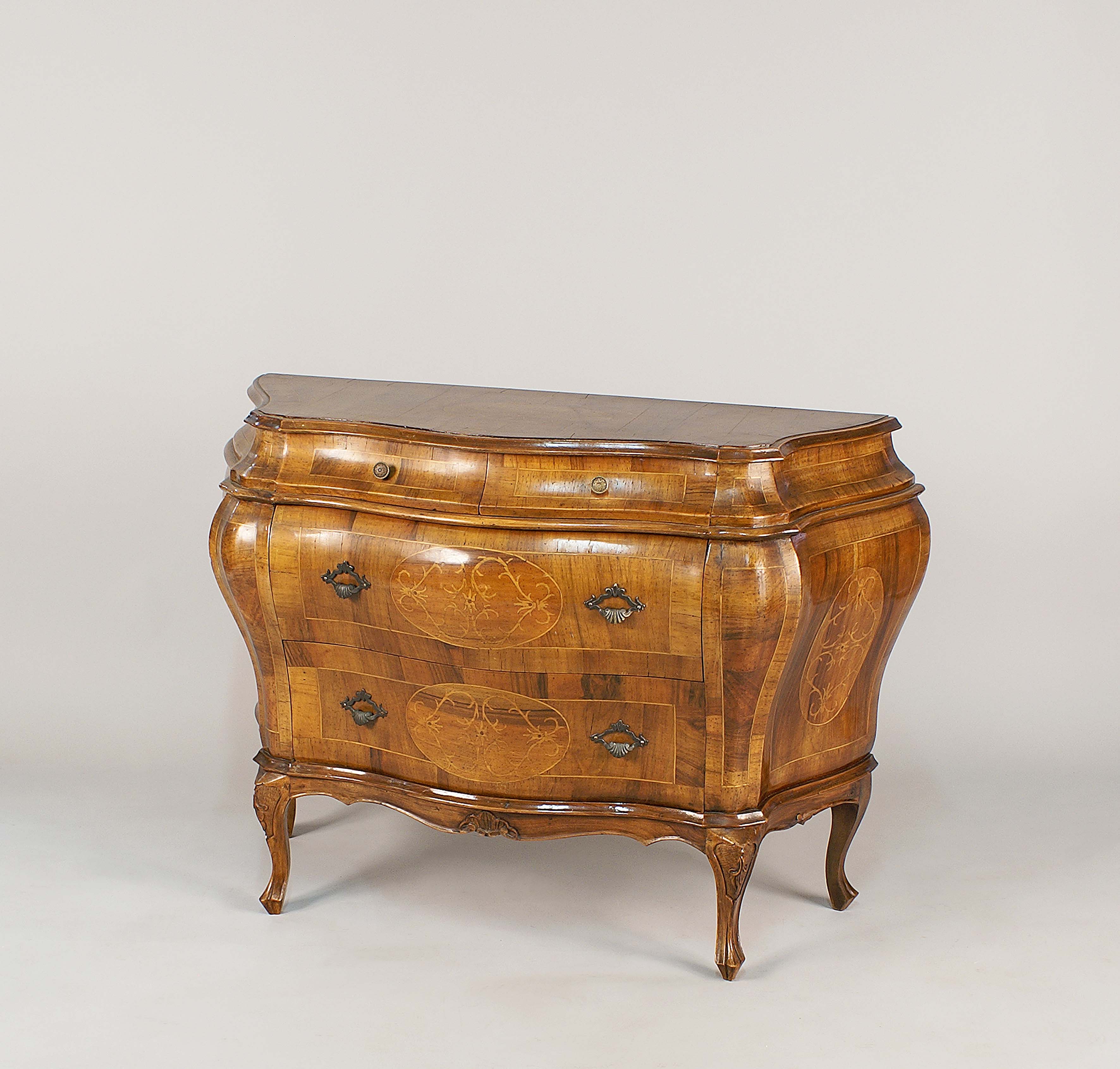 Commode in noce intarsiato e filettato in legno di bosso, di linea bombata, piano sagomato, fronte a tre cassetti, Veneto, vecchia manifattura, cm. 78x115x44.