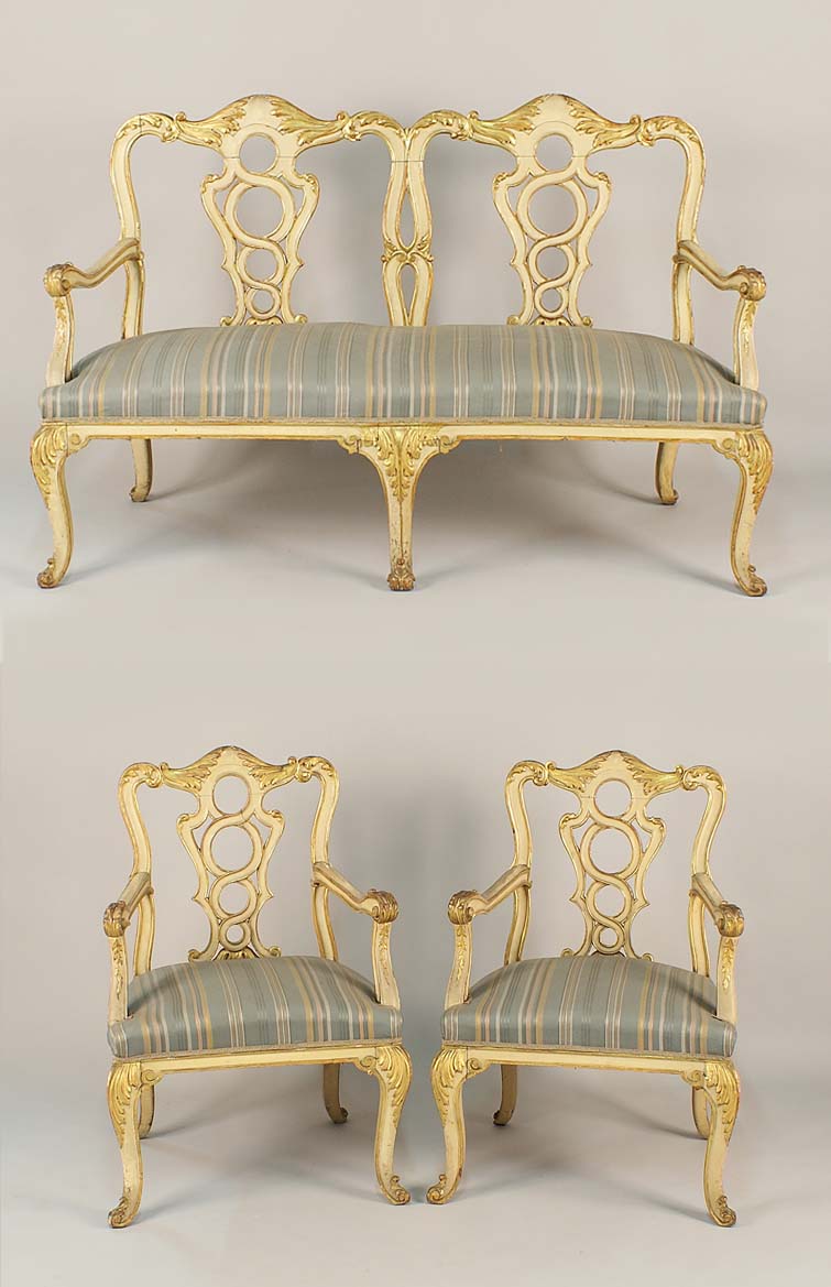 Salotto in legno laccato e dorato, composto da un divano e due poltrone con schienali traforati, braccioli e gambe di linea mossa, fine del XIX secolo.