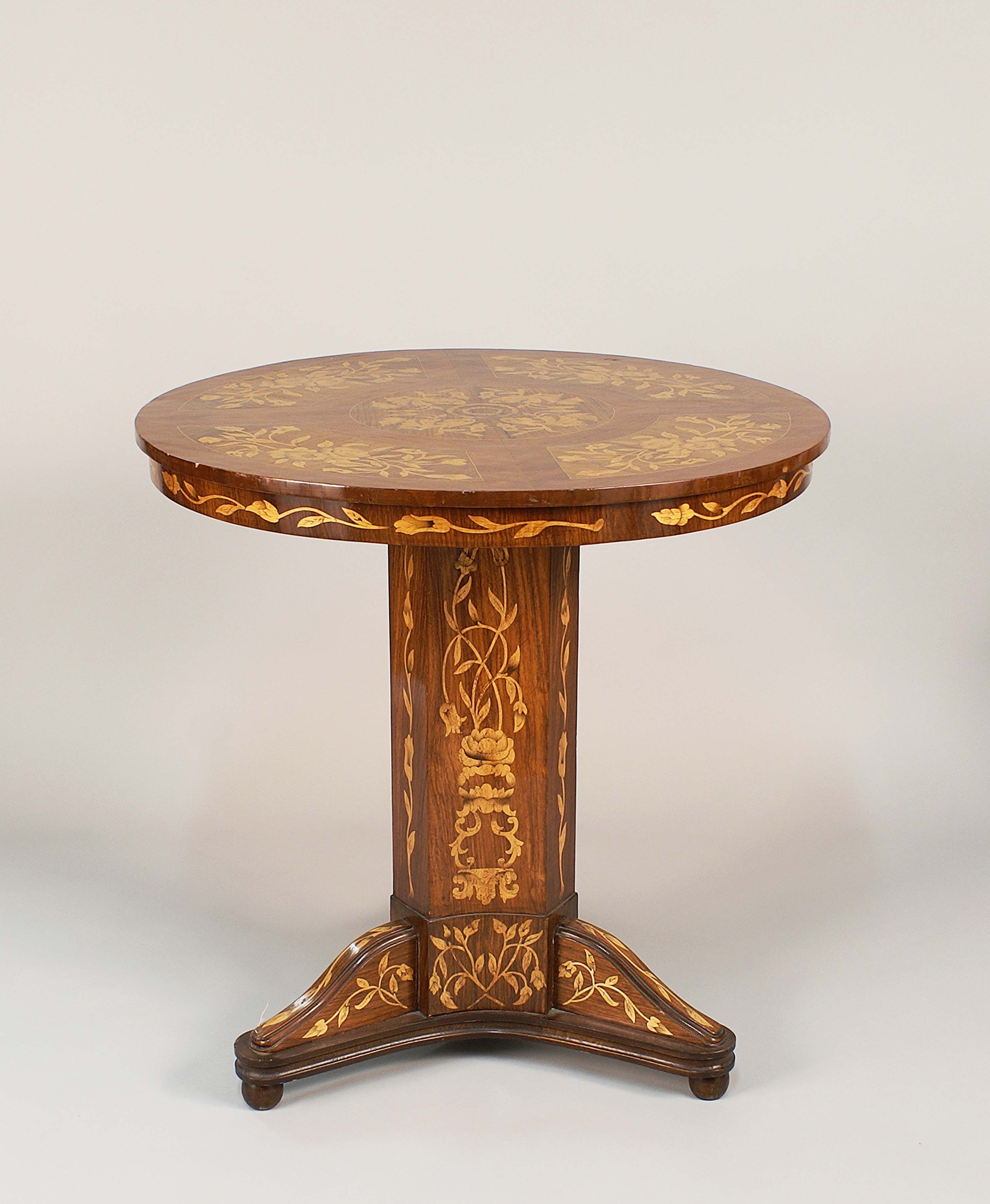 Tavolo da centro in noce intarsiato in legno di frutto a motivi floreali e vegetali, piano circolare poggiante su base esagonale con terminali a tripode, Olanda vecchia manifattura, h. cm. 82 d.cm. 80.