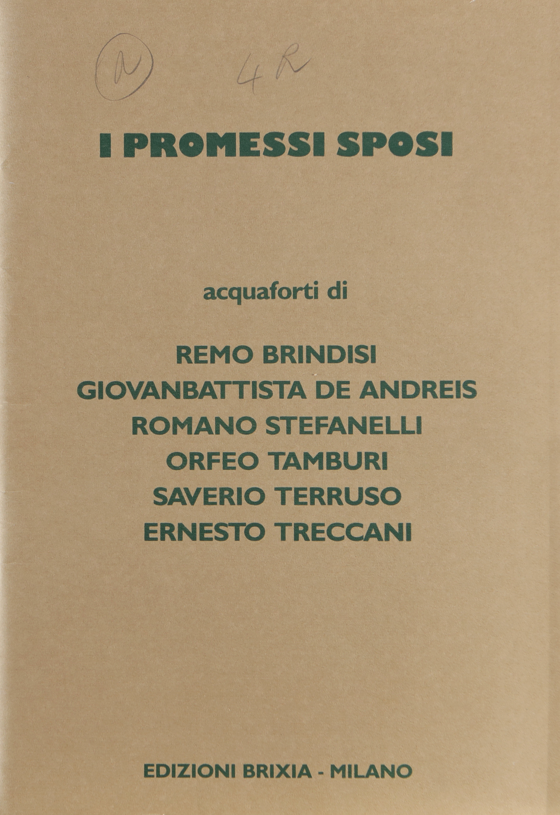 ARTISTI VARI The Betrothed. Etching. Cm 36,00 x 52,00. Folder comprising 6 etchings with the same edition: IV / XXX. Drums: Don Abbondio the lake. Edition, signature and title lower in pencil; plate size: 35x24.5 cm. Stefanelli: The Rape of Lucia. Edition, signature and title lower in pencil; plate size: 22.5x34 cm. Terruso: Interview with Don Rodrigo. Edition, signature and title lower in pencil; plate size: 42x27.5 cm. De Andreis: The Castle. Edition, title, and signature lower in pencil; plate size: 42.5x29.5 cm. Brindisi: The Lazzaretto, prin. Edition, title, and signature lower in pencil; plate size: 35.25 cm. Treccani: Renzo. Edition, title, and signature lower in pencil; plate size: 35x24.5 cm.