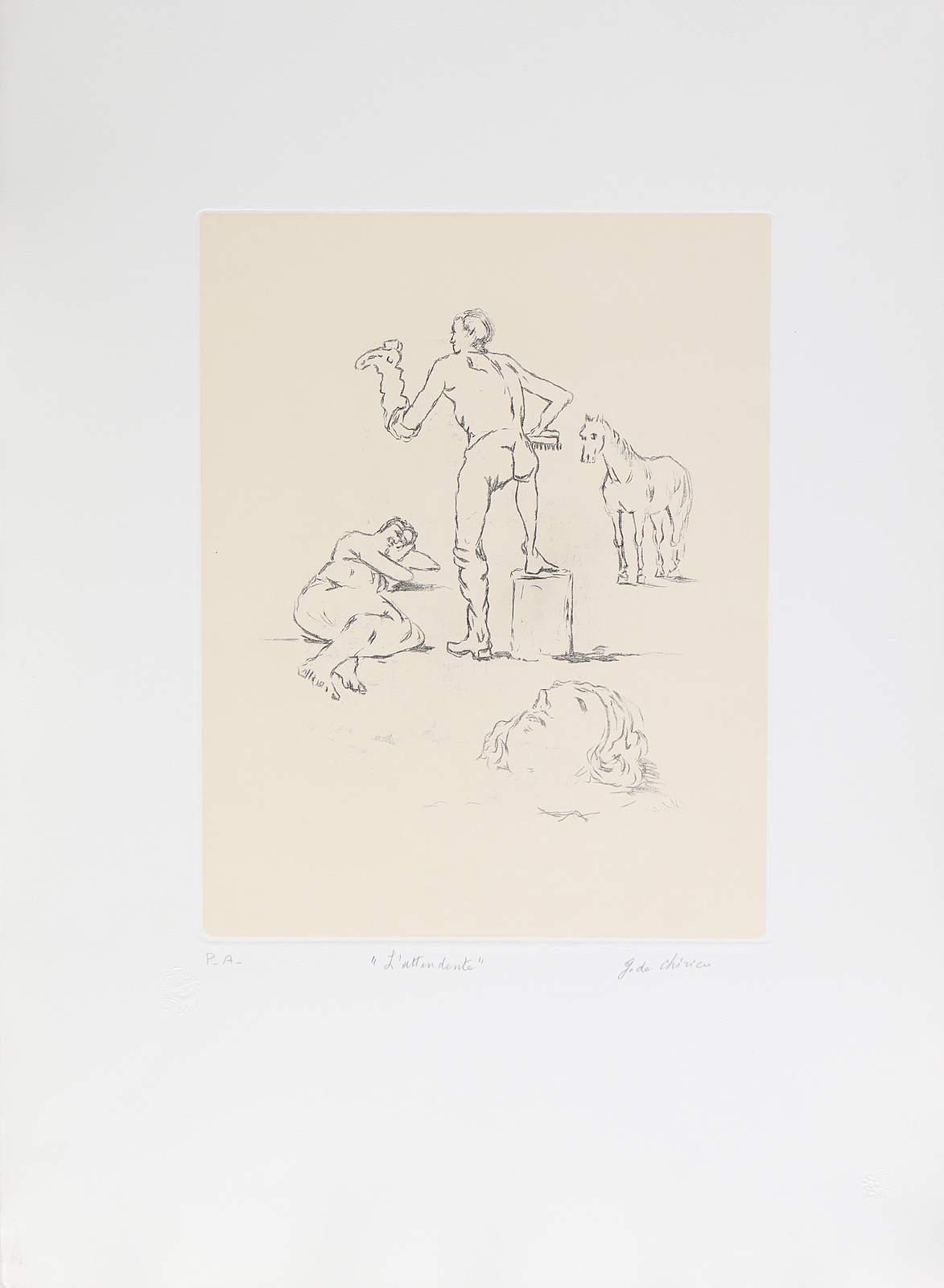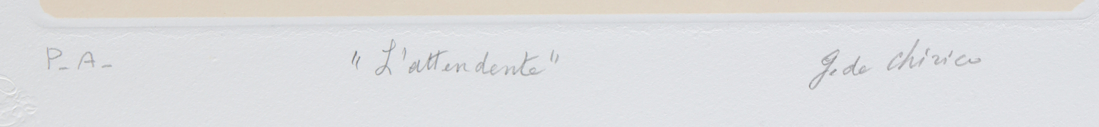 DE CHIRICO GIORGIO (1888 - 1978) The attendant. 1971. Lithograph. Cm 50,00 x 70,00. P.A. Edition, title and signature lower in pencil. Dry stamp G. De Chirico. Dry stamp Alberto Caprini Printer, Rome. sheet size: 38 x 29.5 cm.