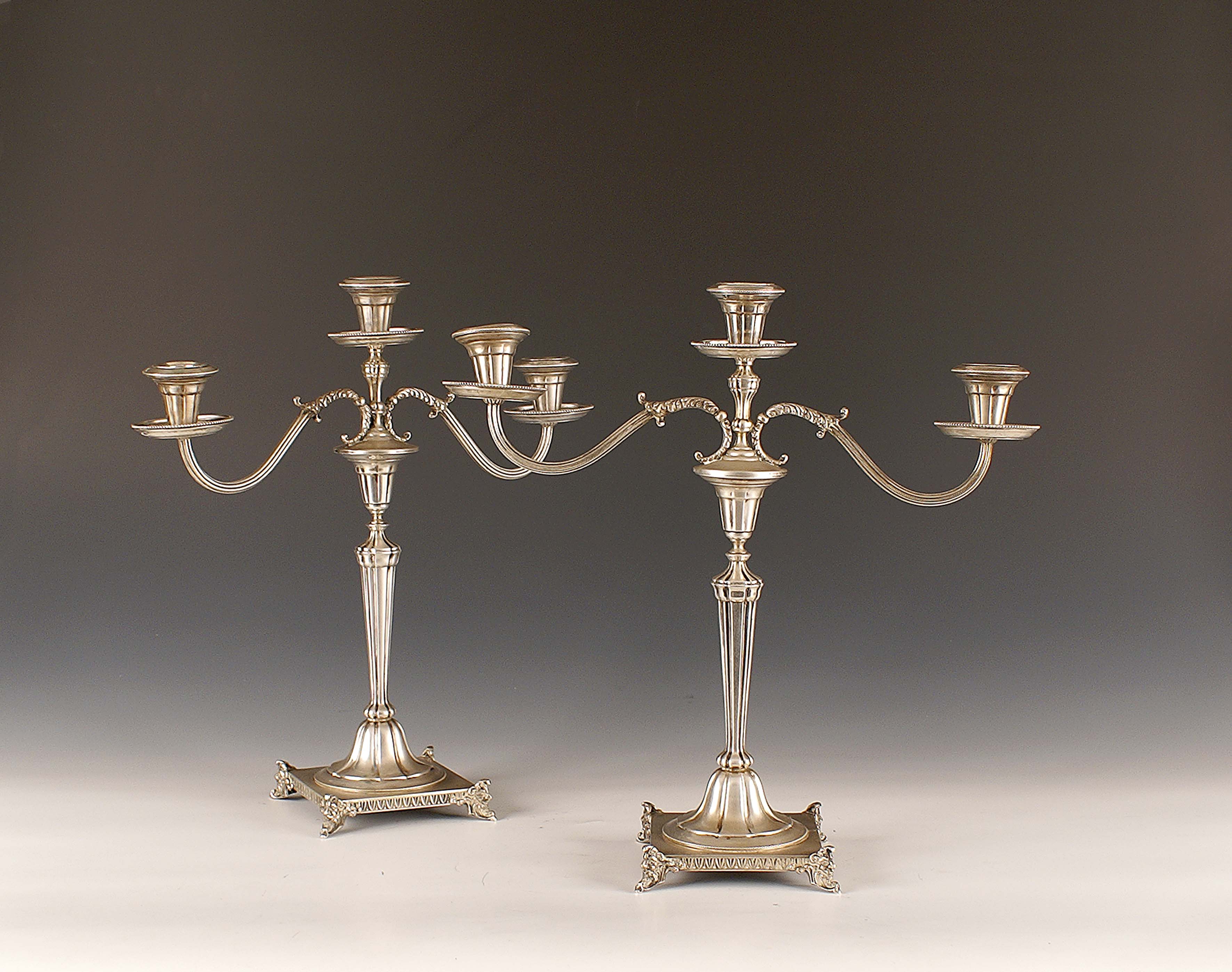 Coppia di candelabri in argento a tre fiamme poggianti su basi squadrate, manifattura italiana, gr. 1450, h. cm. 35.