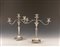 Coppia di candelabri in argento a tre fiamme poggianti su basi squadrate,...