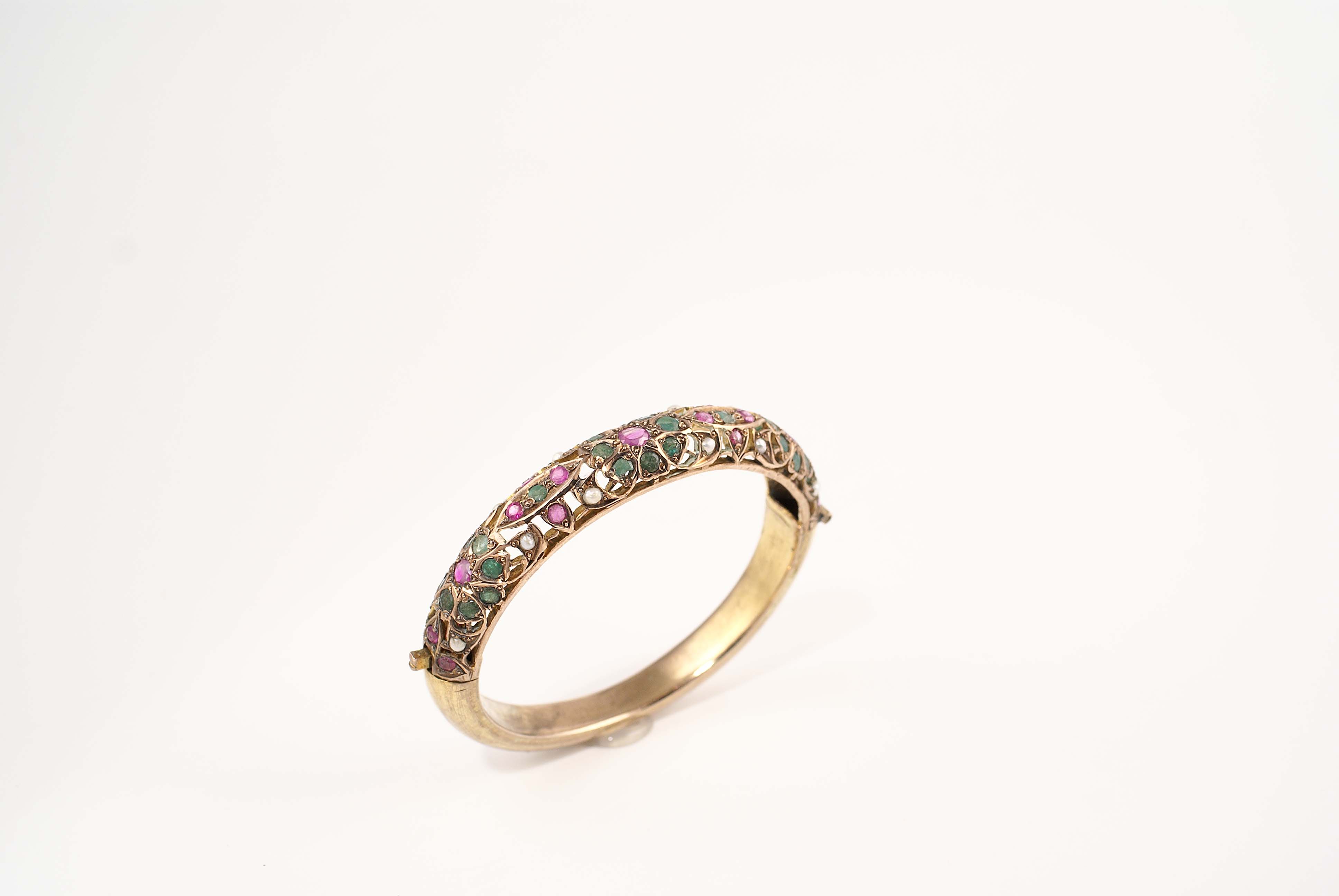 Bracciale a manetta in oro rosso 9kt con incastonati rubini, smeraldi e perle, gr. 31,7 (lieve mancanza).