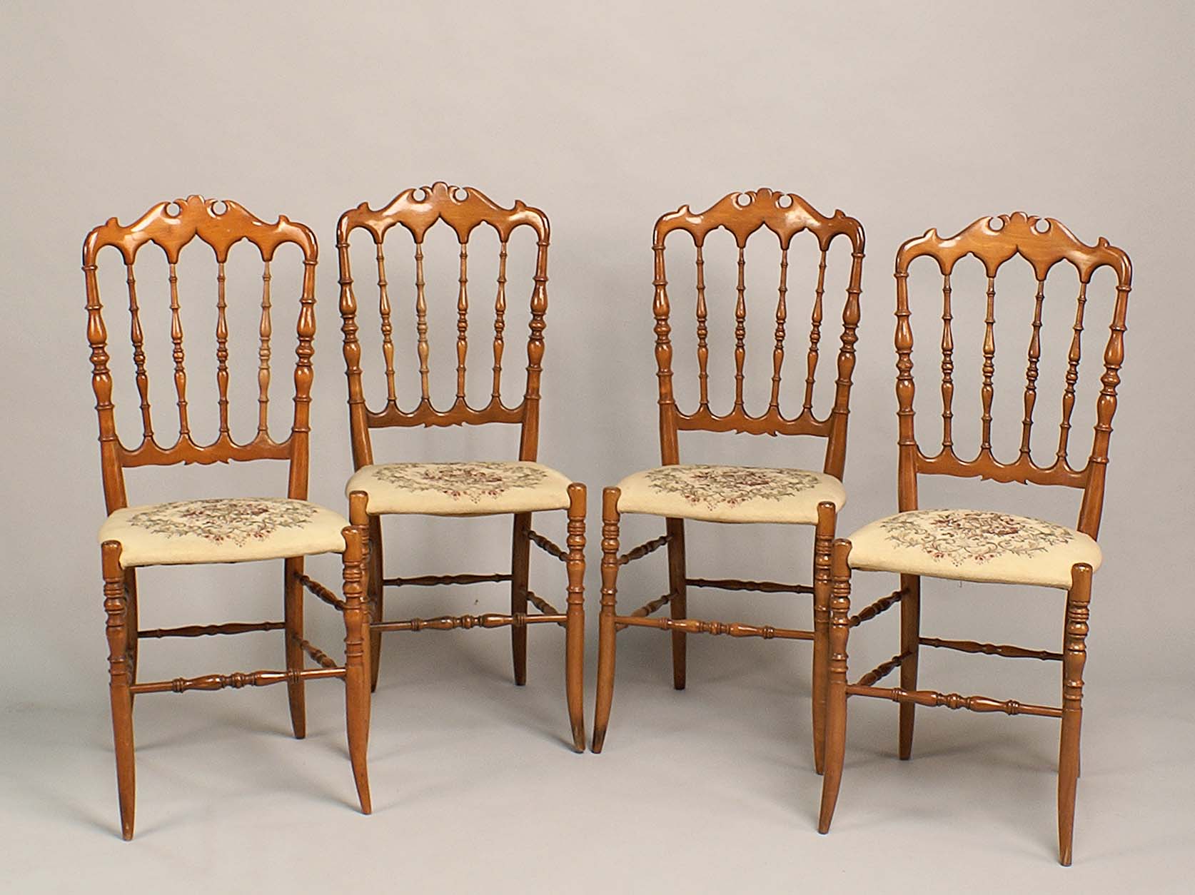 Quattro sedie in faggio, struttura in legno traforato e tornito, seduta imbottita e rivestita in tessuto, vecchia manifattura, h. cm. 96.