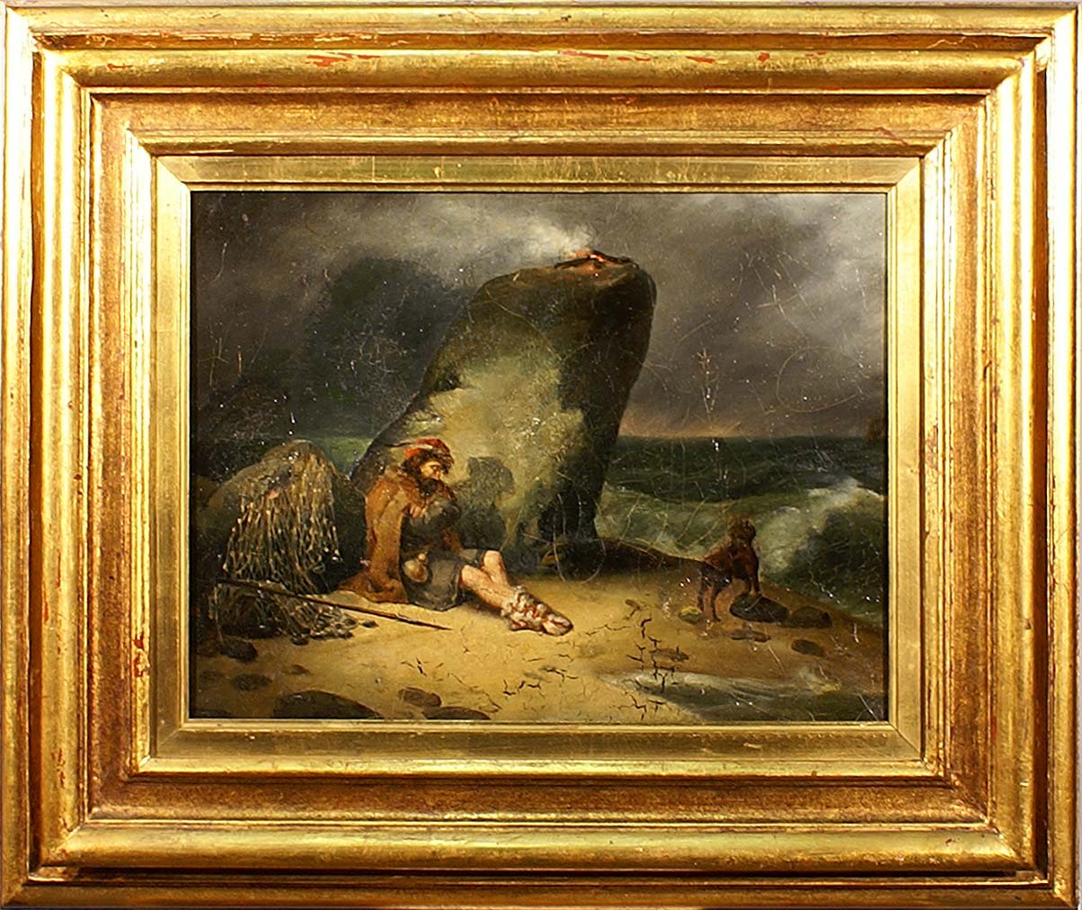 Scuola tedesca del XIX secolo, "Paesaggio marino con pescatori", olio su tela, cm. 38x46 (restauri).