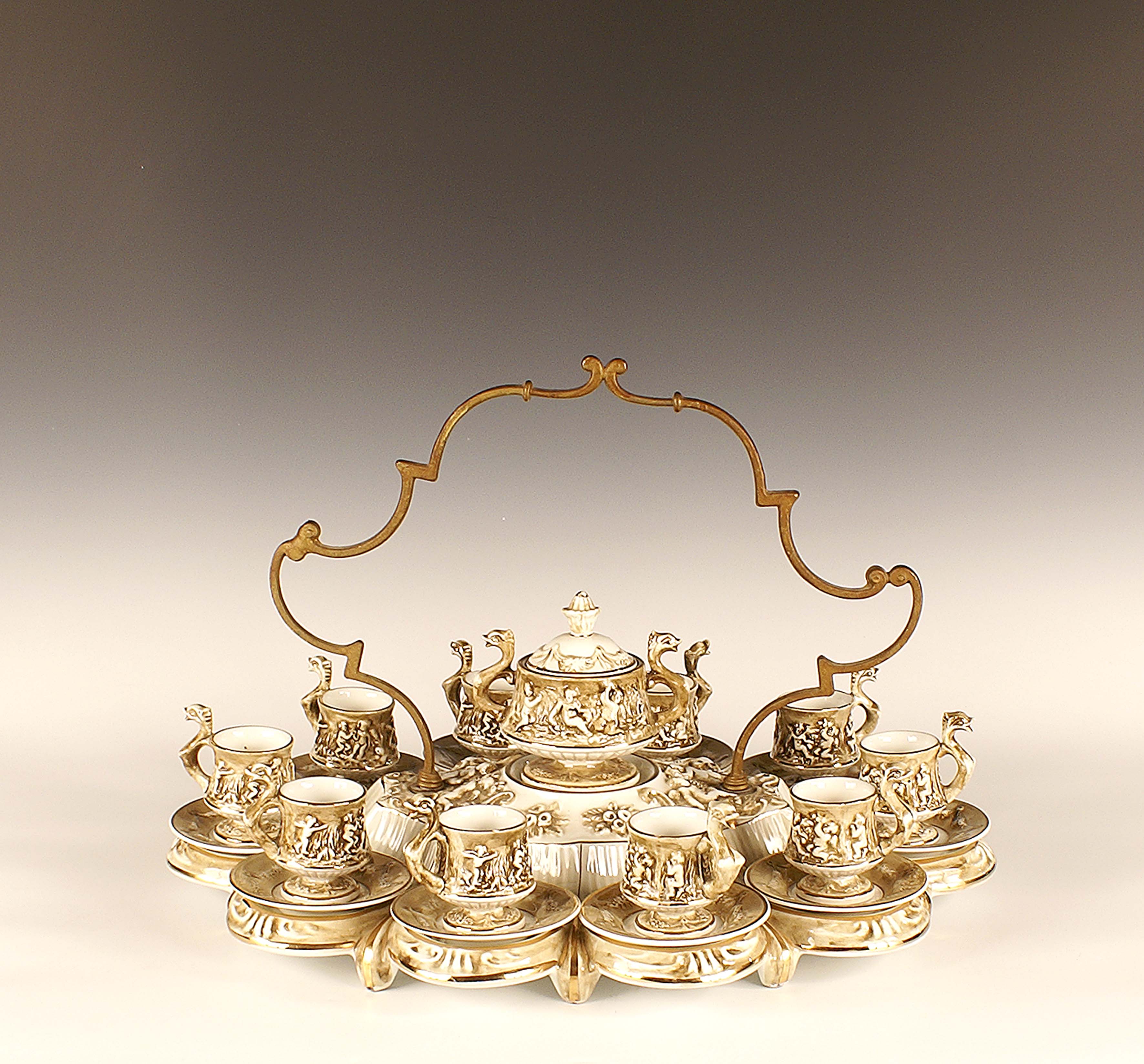 Particolare servizio da caffè in porcellana dipinta e parzialmente dorata composto da dieci tazzine con relativi piattini, una zuccheriera e relativo supporto, vecchia manifattura.