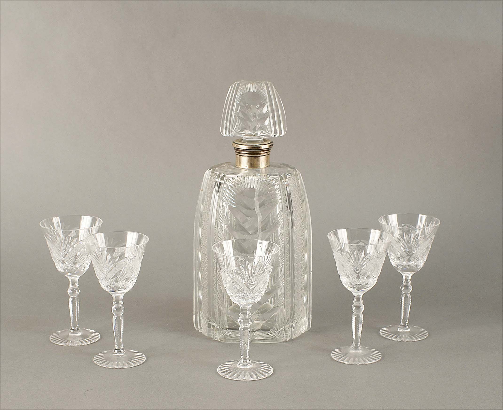 Lotto composto da una bottiglia da liquore in cristallo molato e in argento con relativi quattro bicchieri.