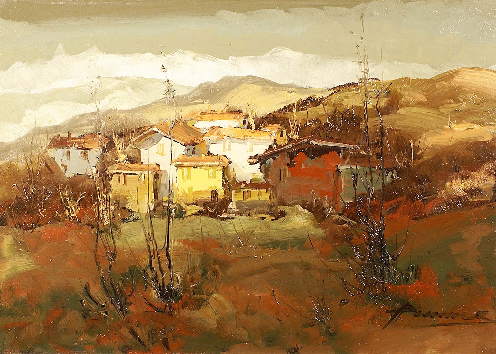Aristide Buonanone (XX secolo), "Paesaggio", olio su tela, cm. 50x70, firmato in basso a destra, datato 1977 sul retro.