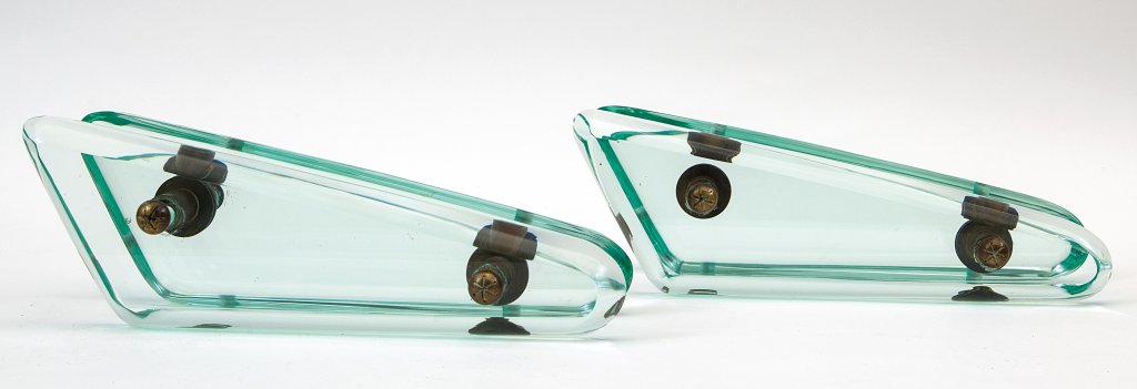 DUE COPPIE DI MANIGLIE, anni '60. Cristallo sagomato molato, ottone. Altezza...