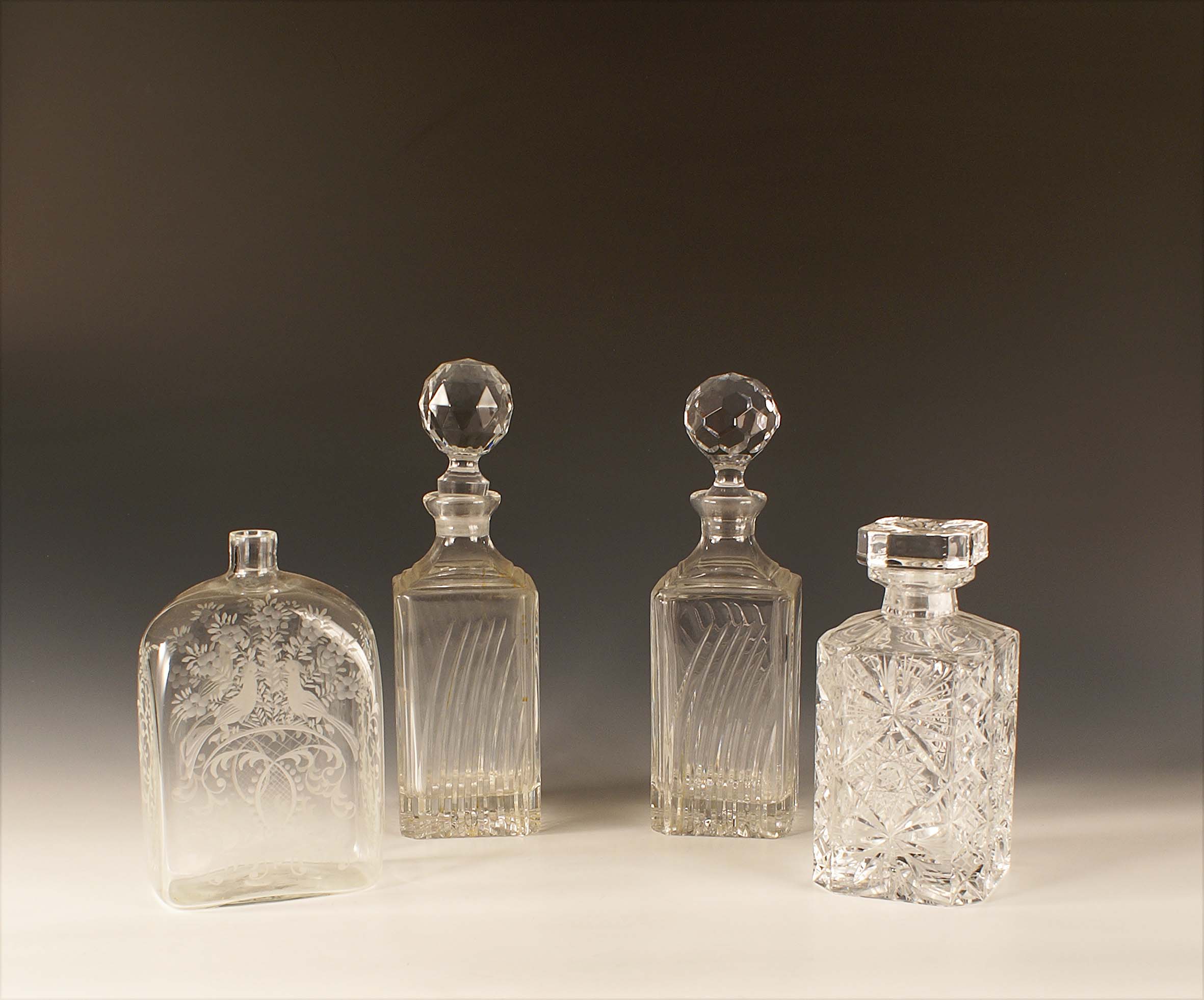 Lotto composto da quattro bottiglie da liquore in cristallo molato ed inciso, fogge e misure diverse.