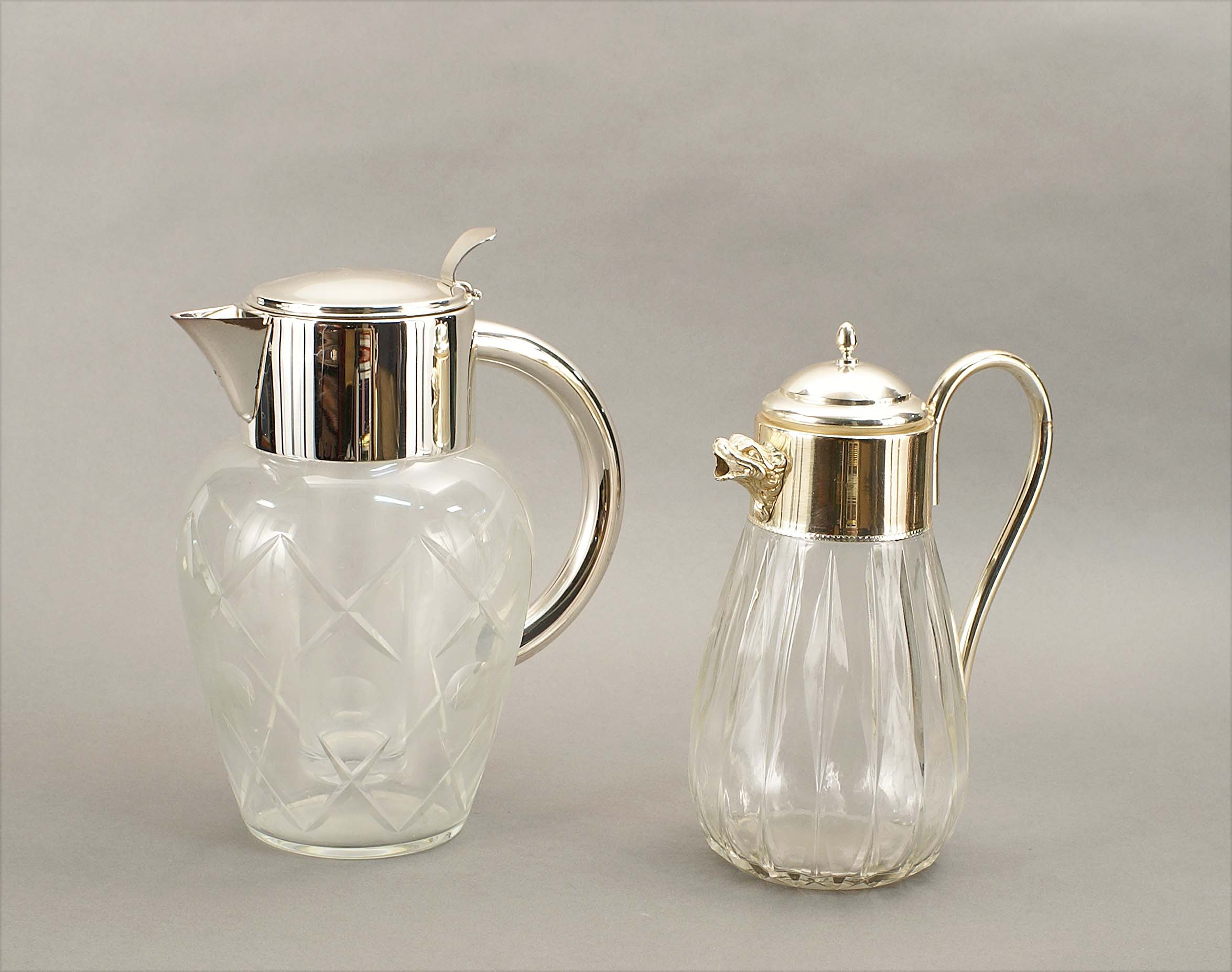 Lotto composto da due caraffe in vetro e metallo, fogge e misure diverse.