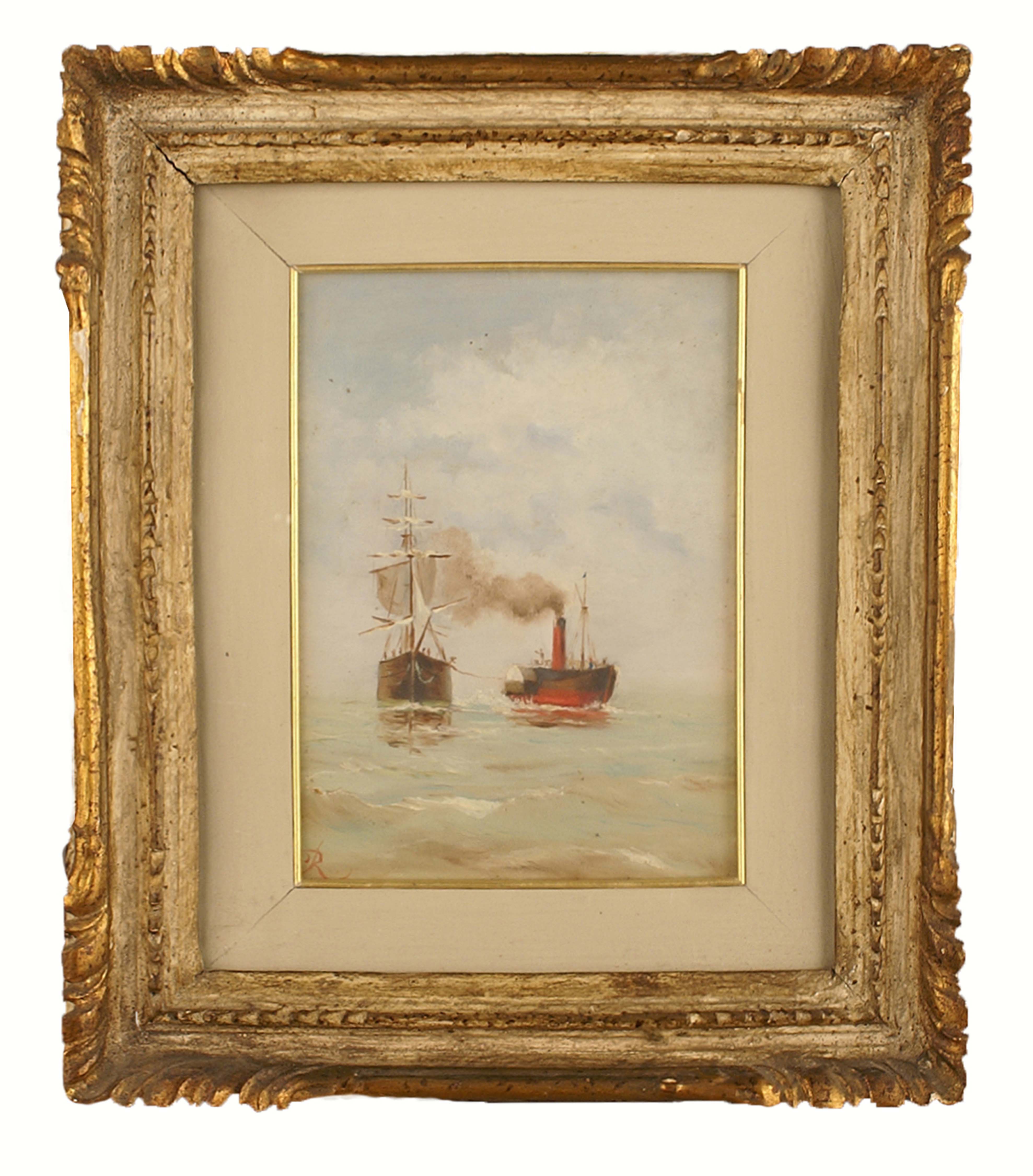 Scuola francese del XIX secolo, "Barche", olio su tavola, cm. 22x16, siglato in basso a sinistra.