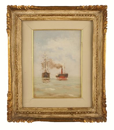 Scuola francese del XIX secolo, "Barche", olio su tavola, cm. 22x16, siglato...