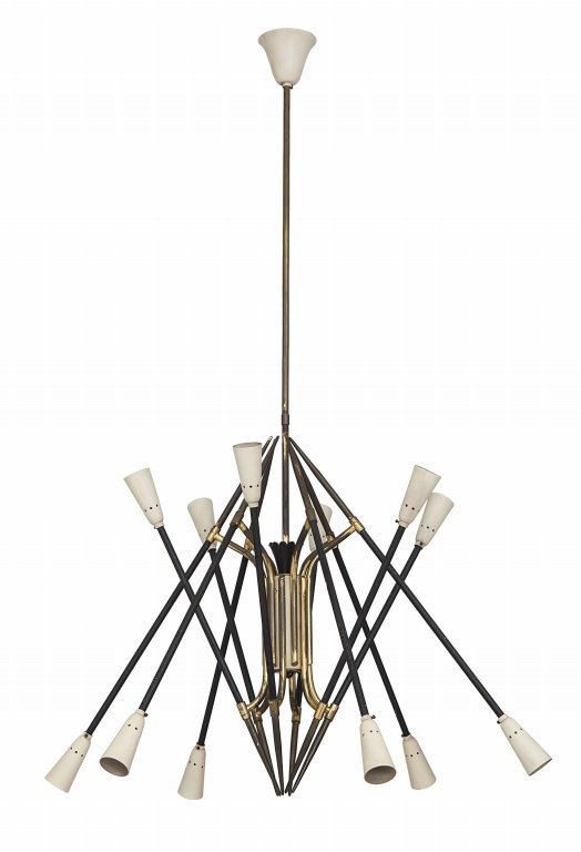 UNA LAMPADA A SOSPENSIONE, anni '50 Ottone, tubo di ferro verniciato,...