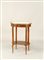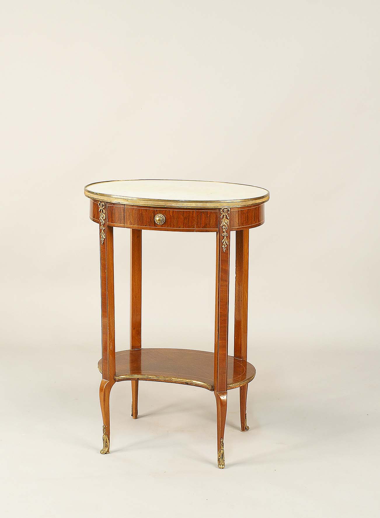 Tavolino in palissandro intarsiato a motivi geometrici e filettato in legno di bosso con applicazioni in bronzo dorato, piano ovale in marmo bianco di Carrara con un tiretto ed un ulteriore piano sottostante, Francia, fine del XIX secolo, cm. 73x50x37.