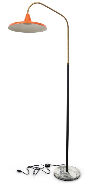 UNA LAMPADA DA TERRA, anni '50. Marmo, tubo di ferro verniciato, ottone,...