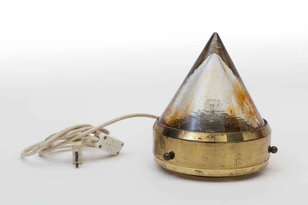 UNA LAMPADA DA TAVOLO, anni '50.Ottone, cristallo stampato.Altezza cm 20,...