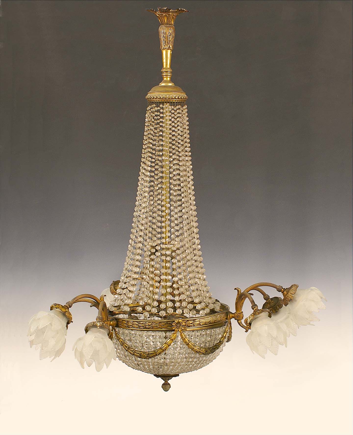 Lampadario a quindici luci in bronzo dorato e cesellato con fili di sfere sfaccettate in cristallo, complete di diffussori in vetro satinato e decorato a motivo floreale, Francia, XIX secolo, h. cm. 107, d. cm. 80 circa (difetti).