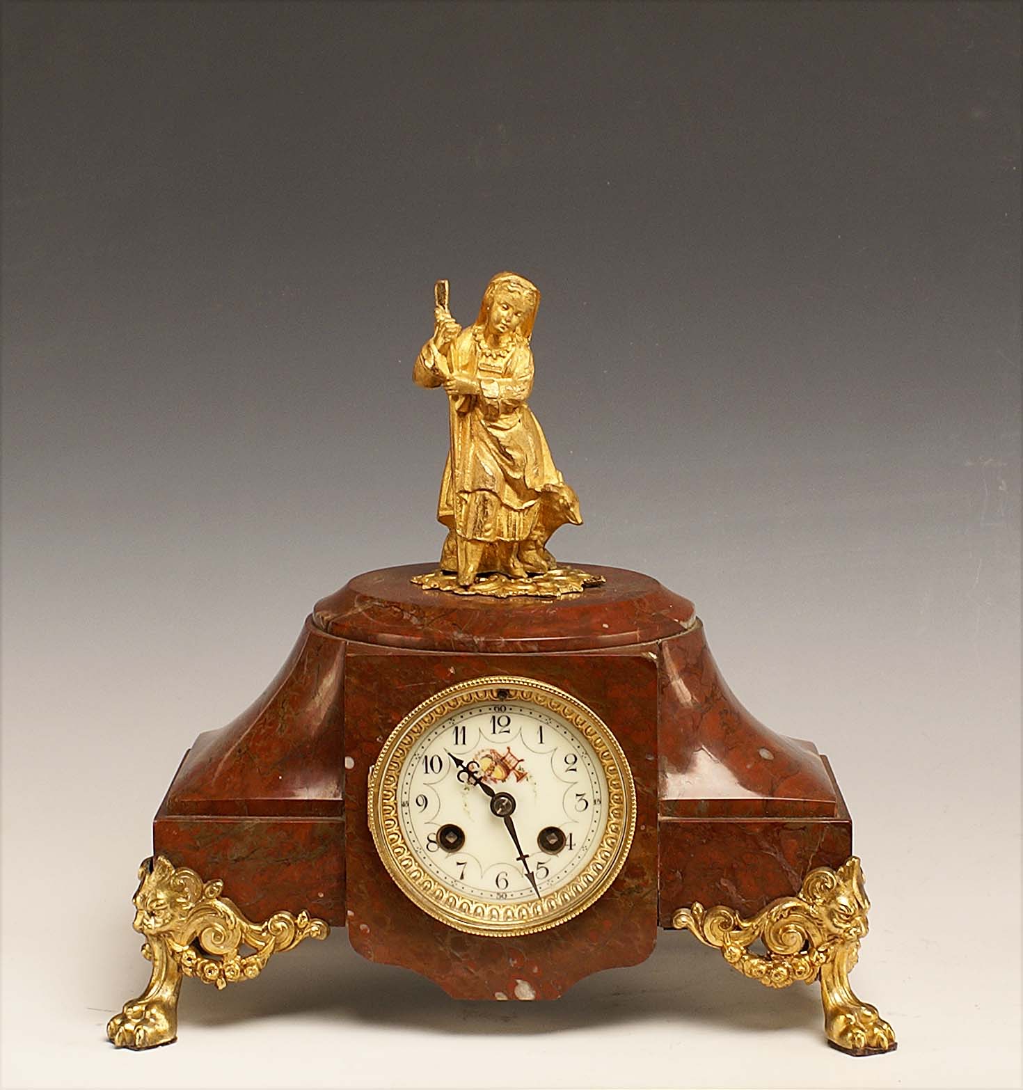 Orologio da camino in marmo rosso Francia con applicazioni in bronzo dorato,...