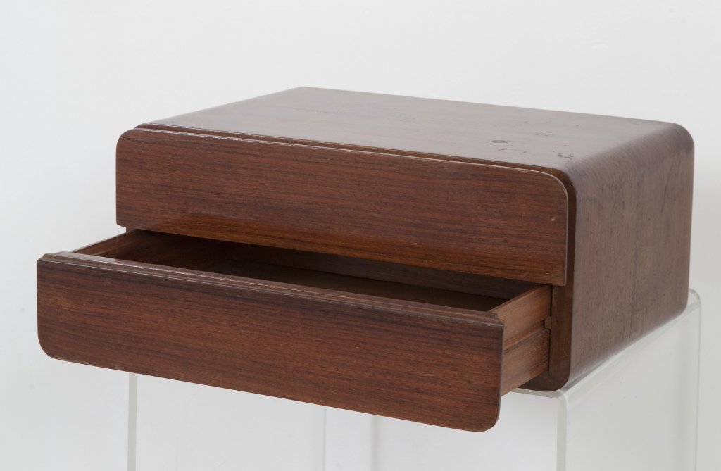 UN COMODINO PENSILE, anni '60. Legno impiallacciato in palissandro, interno...