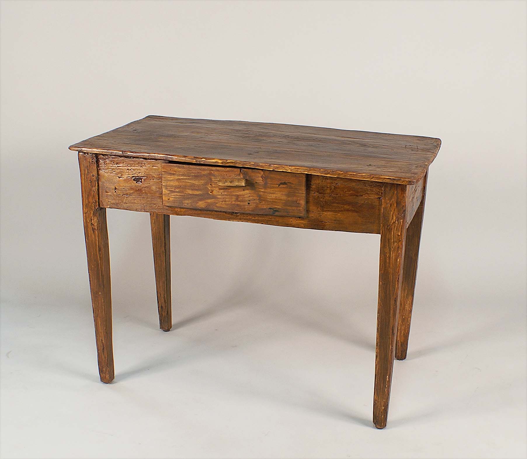 Scrittoio in pioppo tinto noce, piano rettangolare con un cassetto sottostante poggiante su gambe troncopiramidali, vecchia manifattura, cm. 78x105x63.