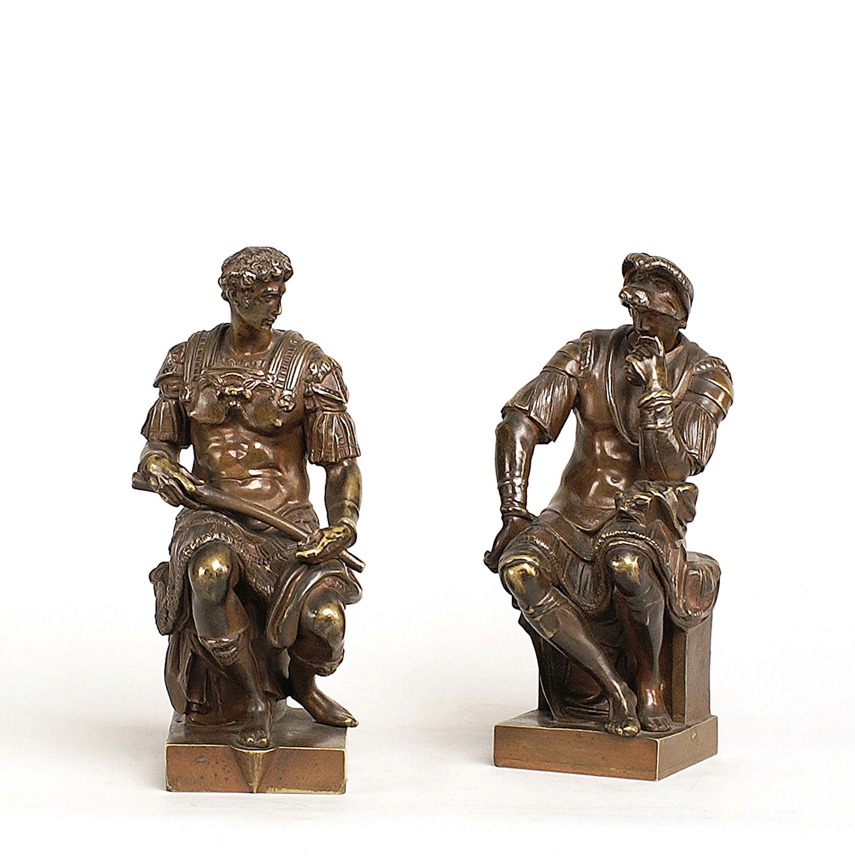 Scuola italiana del XIX secolo, "Soldati romani", coppia di sculture in bronzo patinato, misure diverse.