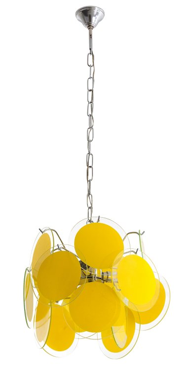 UN LAMPADARIO, anni '70. Struttura in metallo, dischi di vetro con registri...