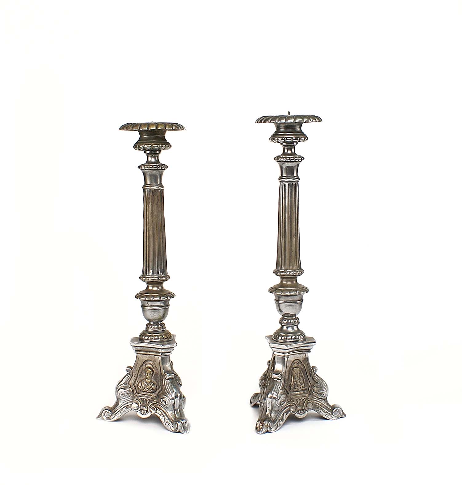 Lotto 300 | Coppia di torcieri in metallo, vecchia manifattura, h. cm. 40.