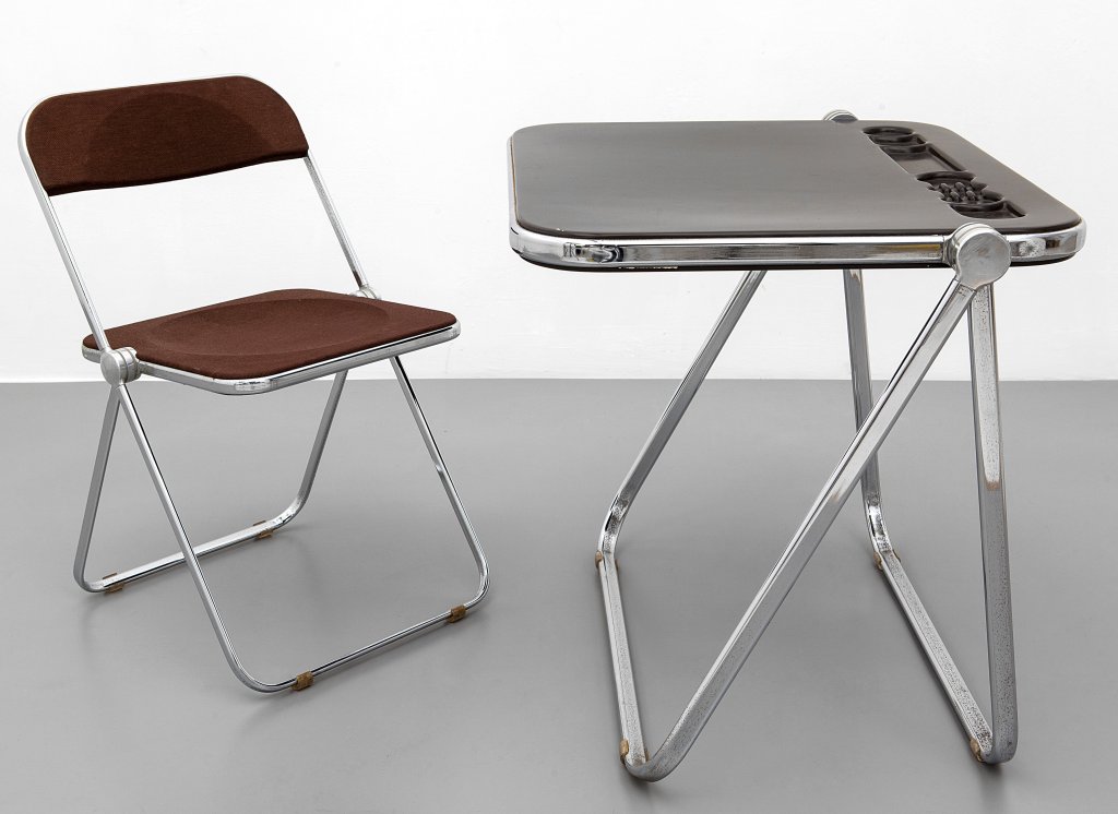 Uno scrittoio "Platone" e una sedia pieghevole "Plia" per ANONIMA CASTELLI, 1970.