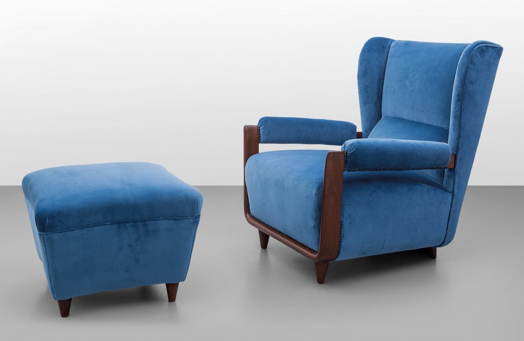 PAOLO BUFFA Una poltrona e un poggiapiedi, anni '30. Legno di mogano,...