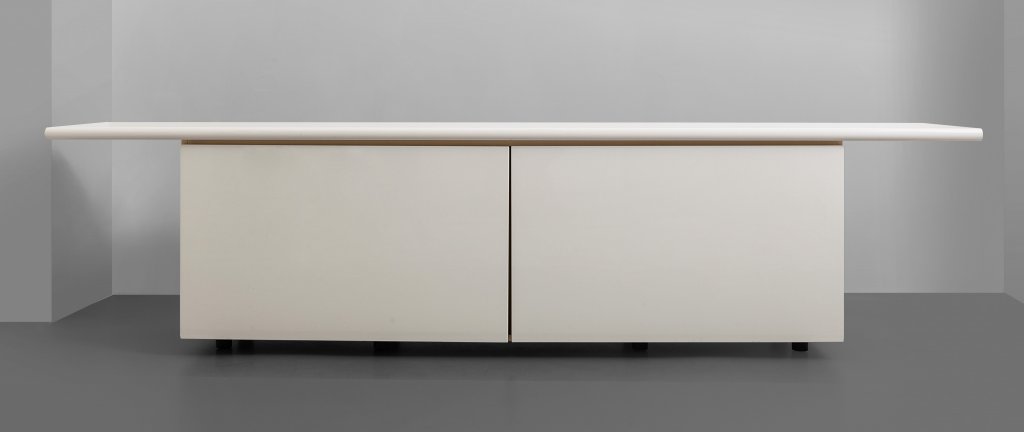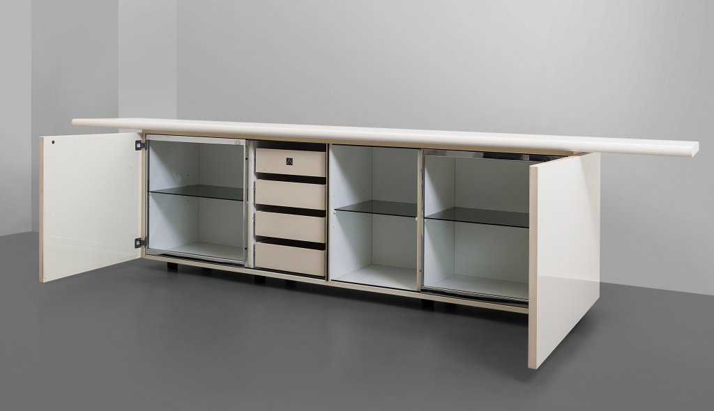 Una credenza "Sheraton" per ACERBIS INTERNATIONAL, 1977, premio COMPASSO D'ORO 1979, esposta alla mostra "Design furniture from Italy" (Tokyo, 1984).
