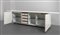 Legno laccato, interni in laminato, due ante dotate di sistema che combina l'apertura scorrevole a quella a cerniera, ripiani in cristallo.