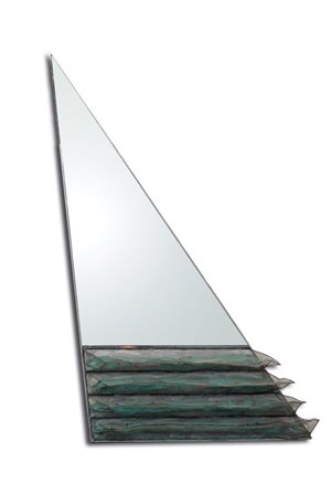 Cornice di alluminio, lastra di rame patinato verde, rete di acciaio inox, cristallo argentato.