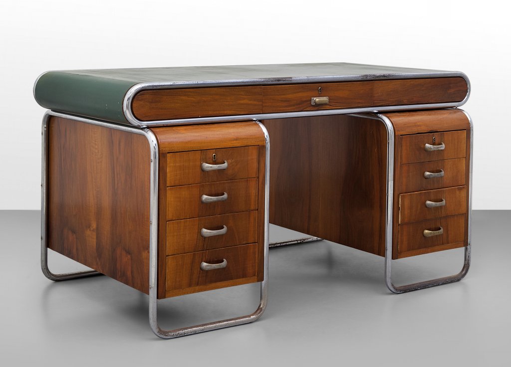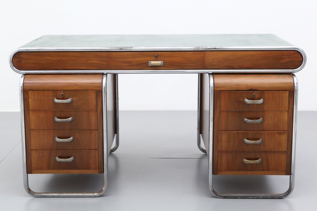 Lotto 1039 | UNA SCRIVANIA, circa 1940. Tubo di acciaio cromato, legno impiallacciato in...