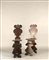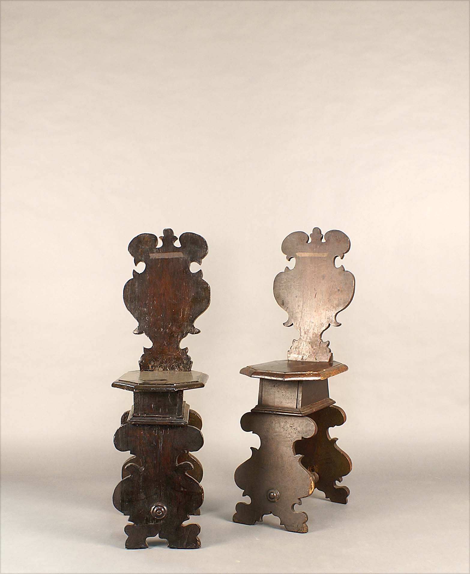 Coppia di sgabelli in noce con seduta ottagonale e schienale sagomato poggianti su sostegni riuniti al centro, Toscana, XVII secolo, h. cm. 106 (restauri).