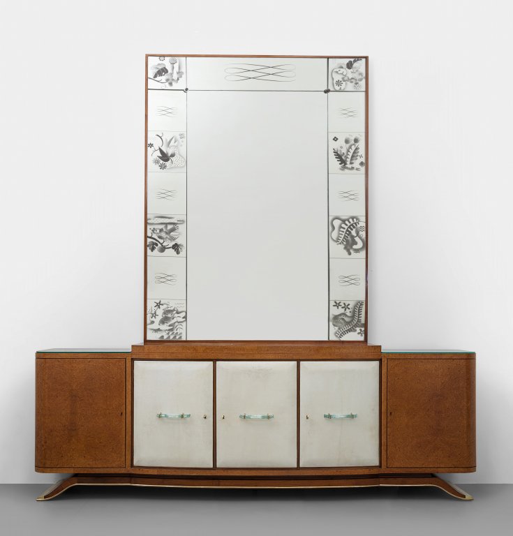 ottone, sportelli rivestiti in pergamena, maniglie in cristallo sagomato molato, interni in ciliegio): cm 95 (h) x 280 x 50 specchiera (legno di noce, cristallo decorato a getto di sabbia, satinato e argentato, marcata sul retro "Luigi Brusotti Milano ottobre 1939"): cm 200 x 150.