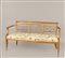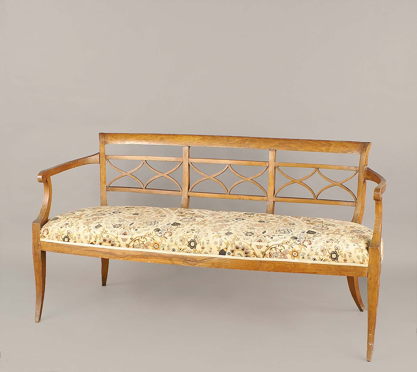 Divano in faggio con schienale traforato, seduta imbottita e rivestita in tessuto, vecchia manifattura, cm. 82x154x52.