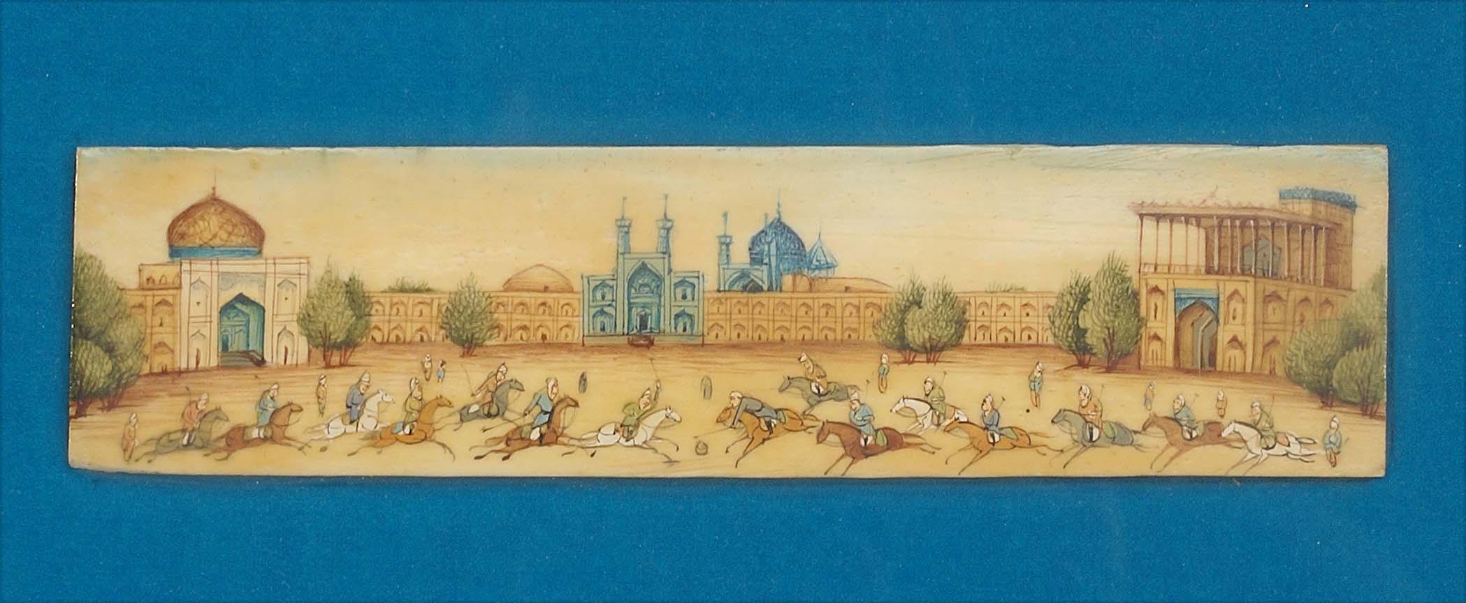 Scuola persiana dei primi anni del XX secolo, "Giocatori di Polo", placca dipinta su avorio, cm. 5x20.