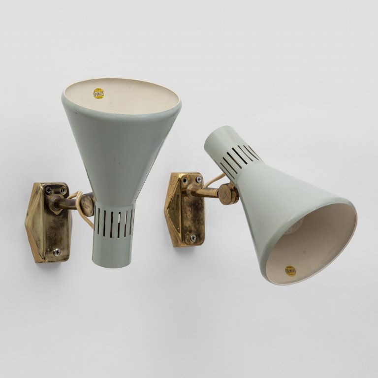 STILNOVO Due lampade a parete, anni '50. Ottone, alluminio laccato.Marchio...