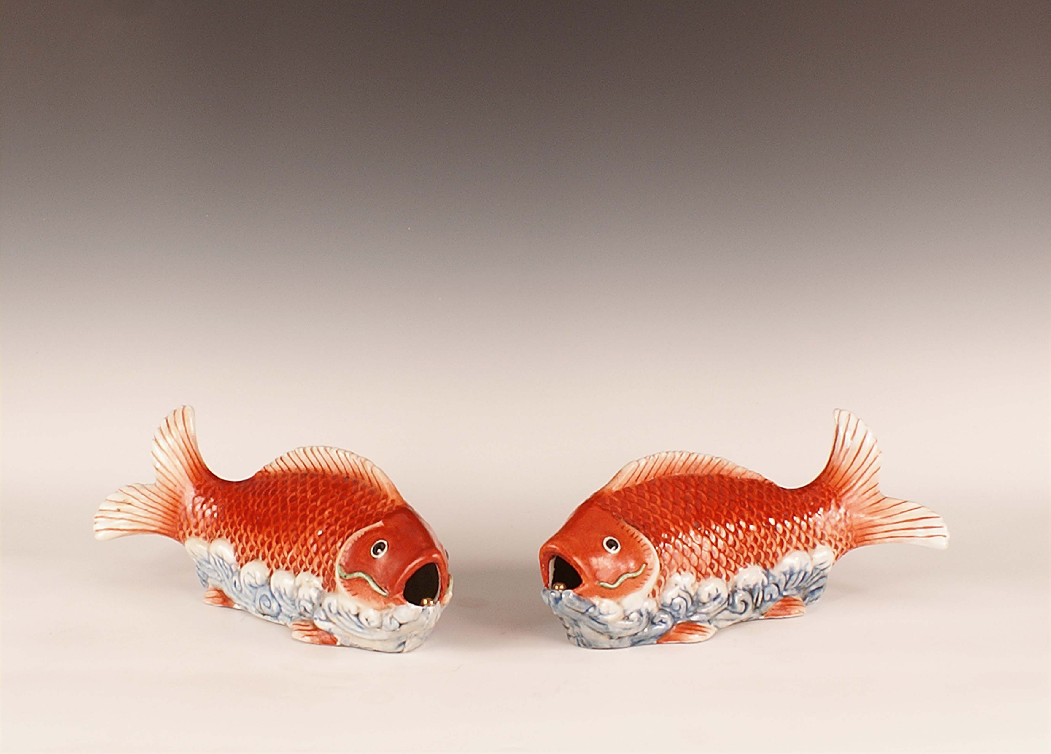 Coppia di sculture in porcellana raffiguranti due pesci, Cina, vecchia...