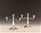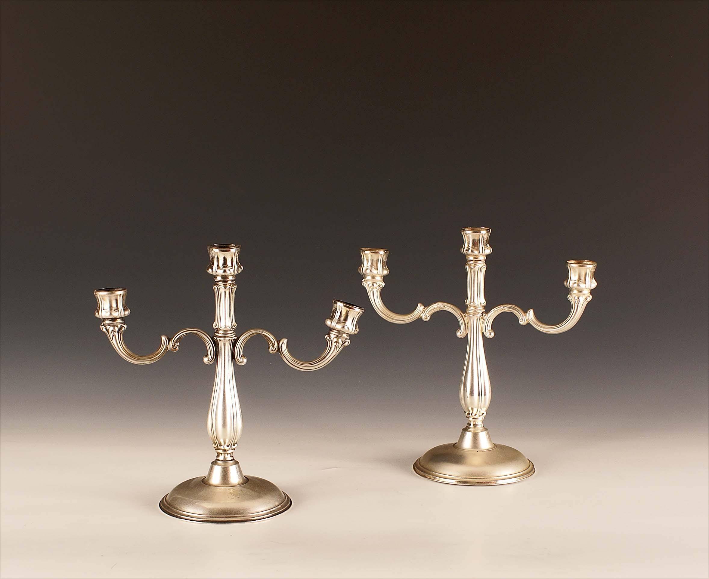 Coppia di candelabri in argento a tre fiamme, gr. 580, h. cm.22.