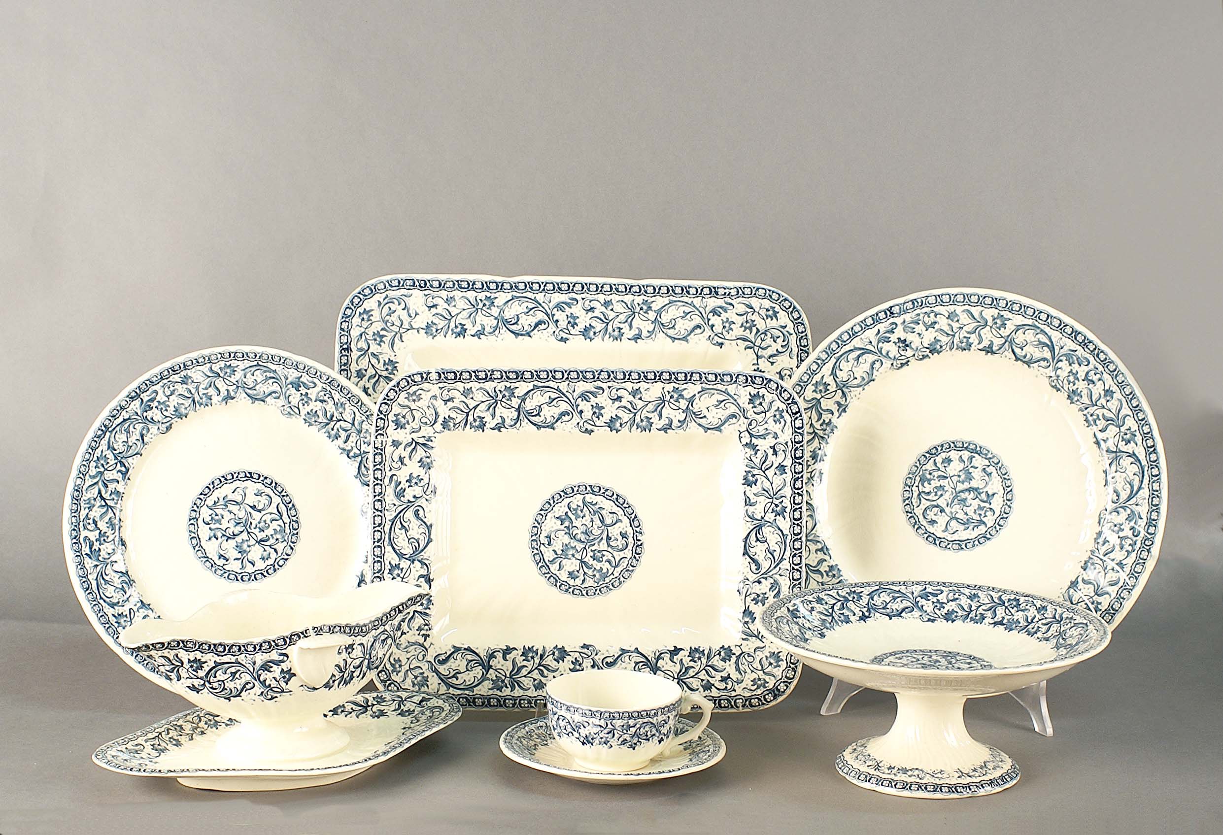 Servizio di piatti in maiolica decorata blu cobalto, composto da 24 piatti piani, 14 piattini, quattro piatti da portata, una insalatiera, due alzate, una salsiera, due raviere, dieci tazze the con relativi dieci piattini, Francia, vecchia manifattura.