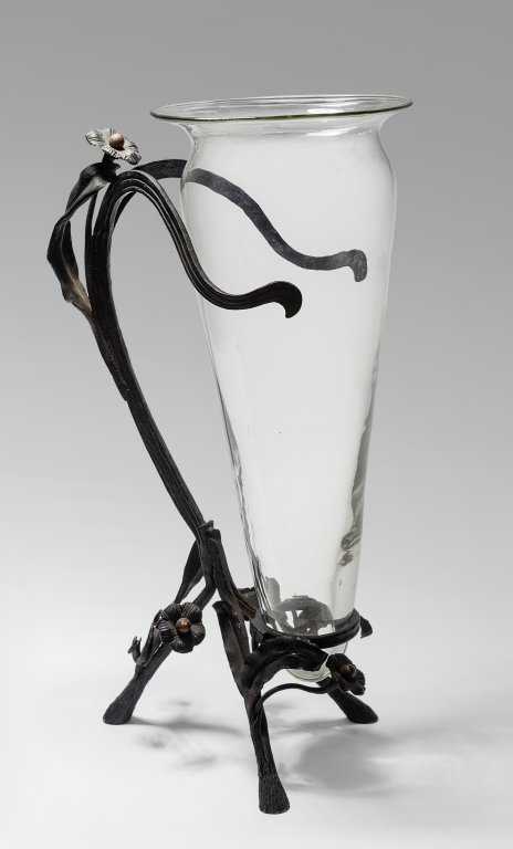 Un vaso in vetro soffiato montato su ferro battuto, circa 1915.