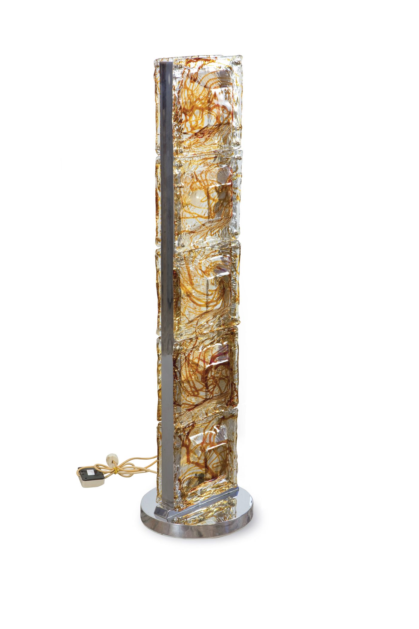 MAZZEGA (ATTRIBUITO) - Lampada da terra. Formelle in vetro di Murano sorrette da struttura in metallo cromato. 1970 circa. H cm 122