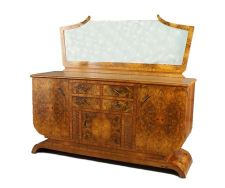 Lotto 349 | Credenza Decò con relativa specchiera in noce con sezioni intagliate a...
