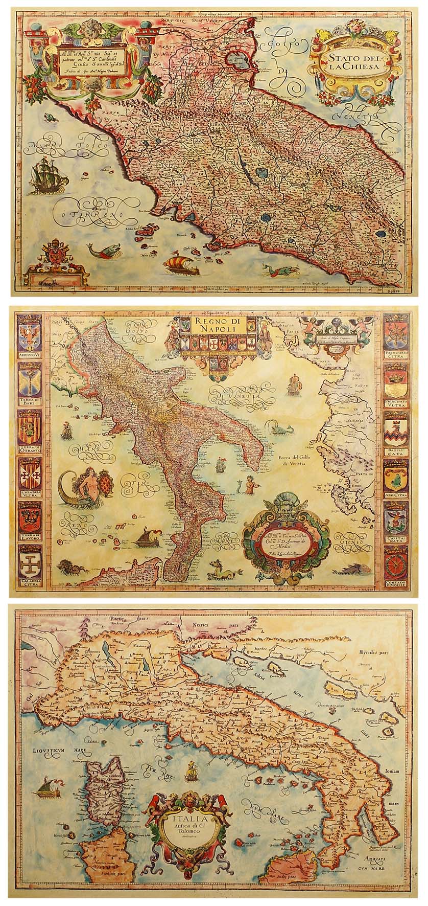 Lotto composto da tre cartine geografiche su carta colorate a mano, cm. 50x70.