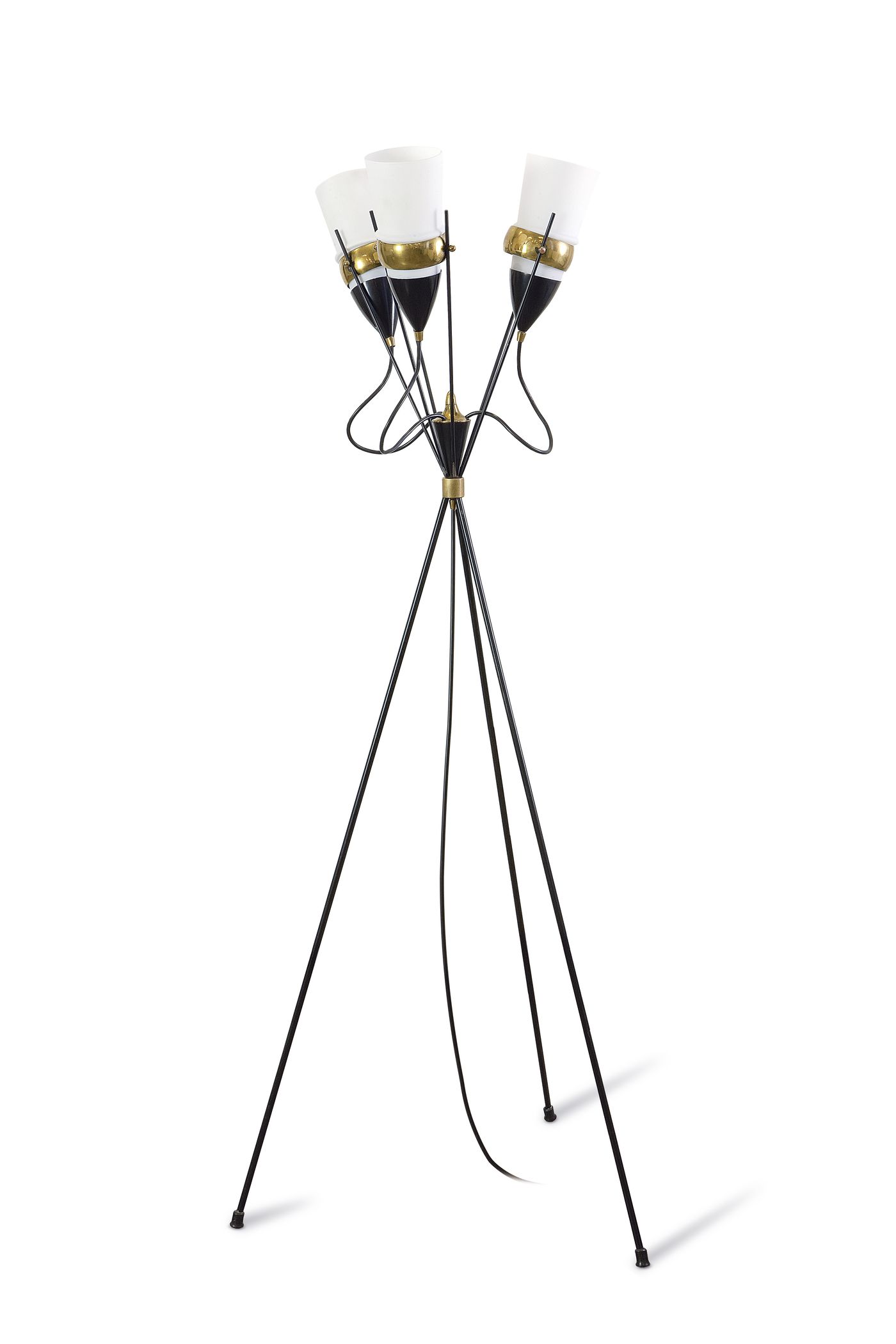 LAMPADA - Lampada da terra in metallo laccato nero con diffusori orientabili in vetro opalino. 1950 circa. H cm 154